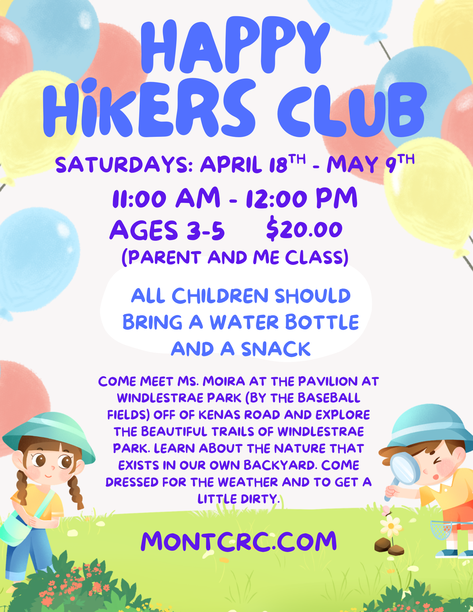 Come meet Ms. Moira at the Pavilion at Windlestrae Park off of Kenas Road and explore the beautiful trails of Windlestrae Park. Learn about the nature that exists in our own backyard. Come dressed for the weather and to get a little dirty.